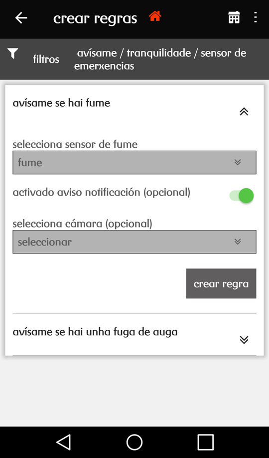 busca la regla: avísame si hay humo. Puedes configurar la misma alerta para el detector de agua, buscando la regla: "avísame si hay una fuga de agua".